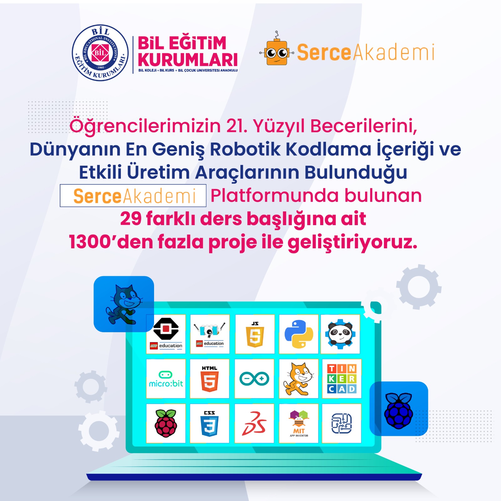 Öğrencilerimizin 21. Yüzyıl Becerilerini, Dünyanın En Geniş Robotik Kodlama İçeriği ve Etkili Üretim Araçlarının Bulunduğu Serçe Akademi Platformunda bulunan 29 farklı ders başlığına ait 1300'den fazla proje ile geliştiriyoruz.