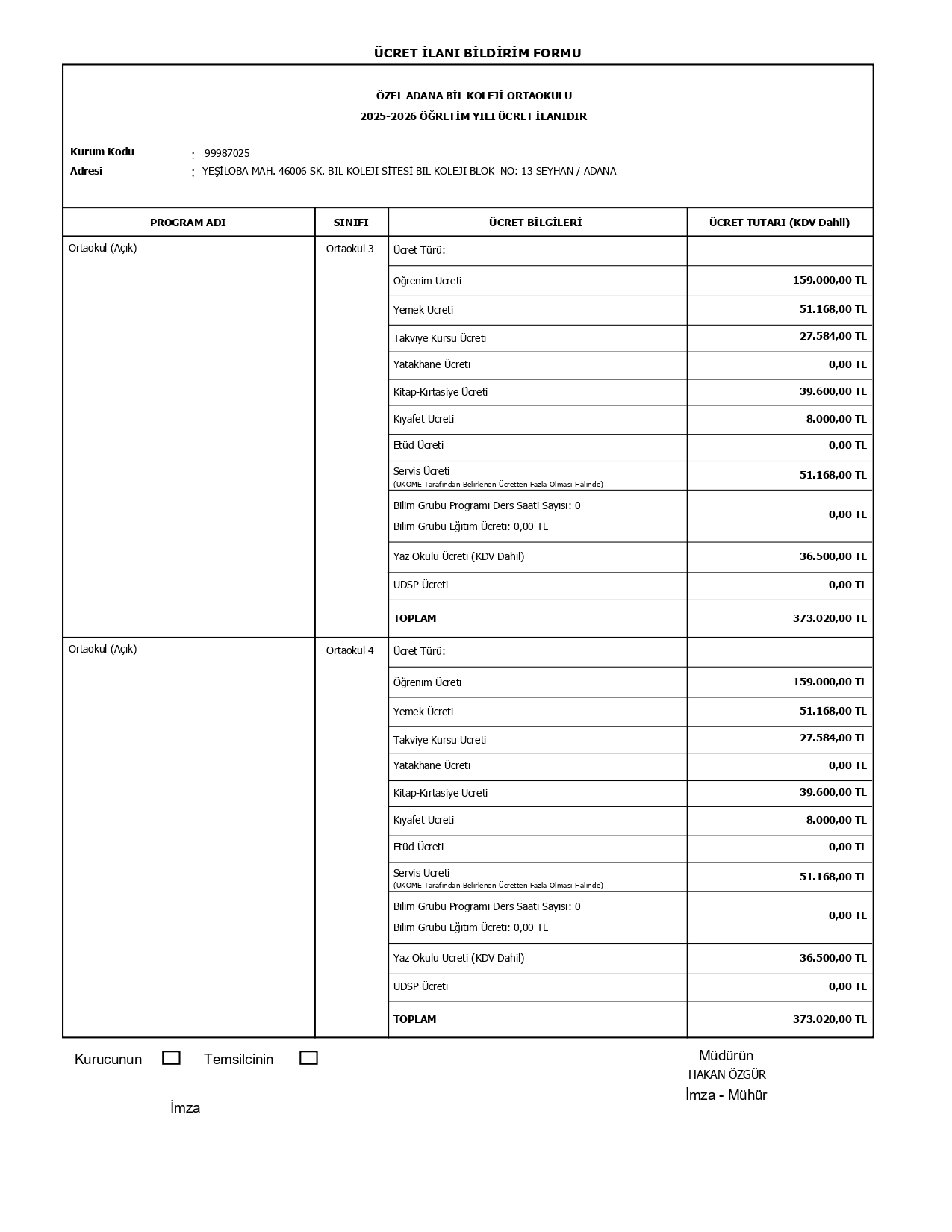 2025-2026 ÖĞRETİM YILI ÜCRET İLANI