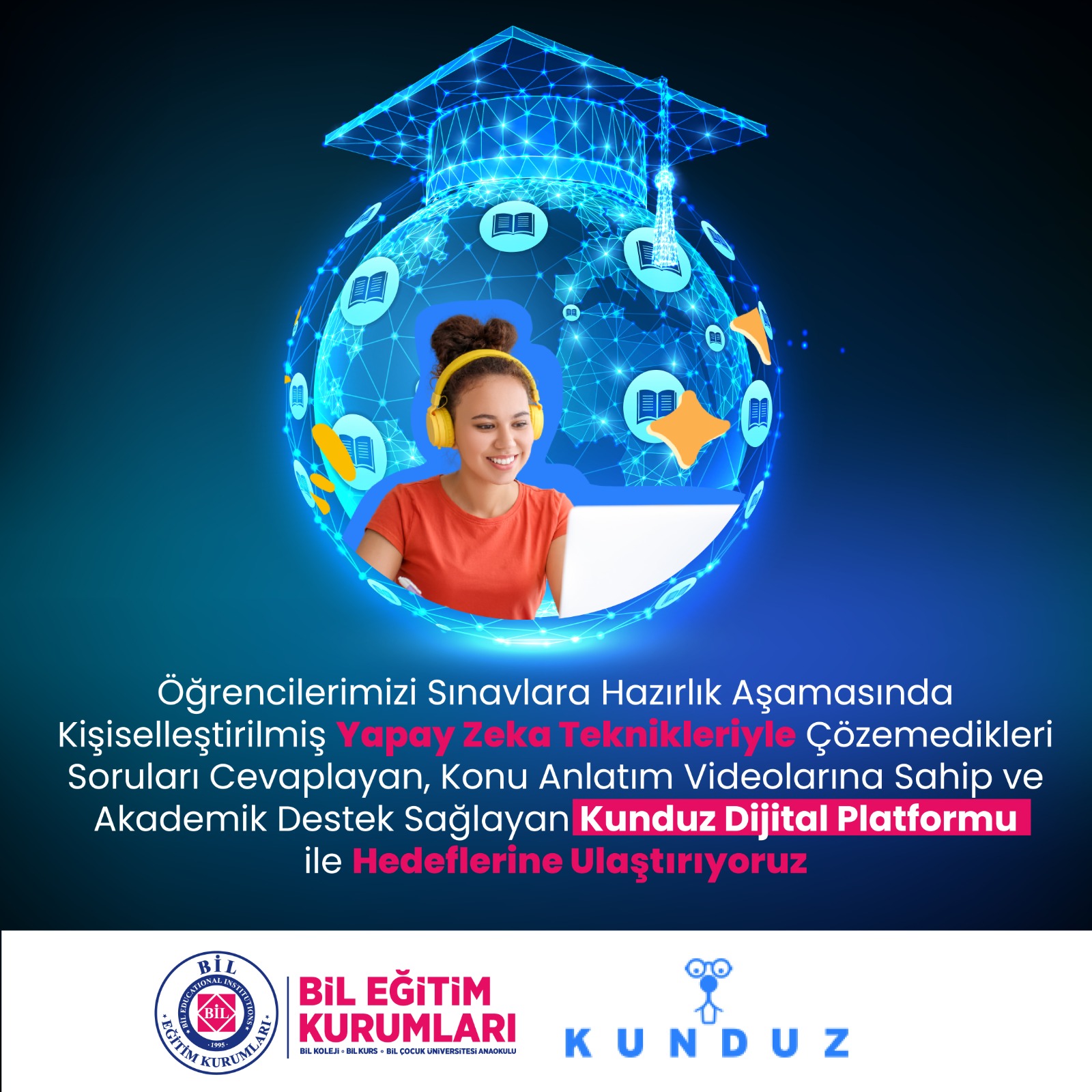 Öğrencilerimizi Sınavlara Hazırlık Aşamasında Kişiselleştirilmiş Yapay Zeka Teknikleriyle Çözemedikleri Soruları Cevaplayan, Konu Anlatım Videolarına Sahip ve Akademik Destek Sağlayan Kunduz Dijital Platformu ile Hedeflerine Ulaştırıyoruz.