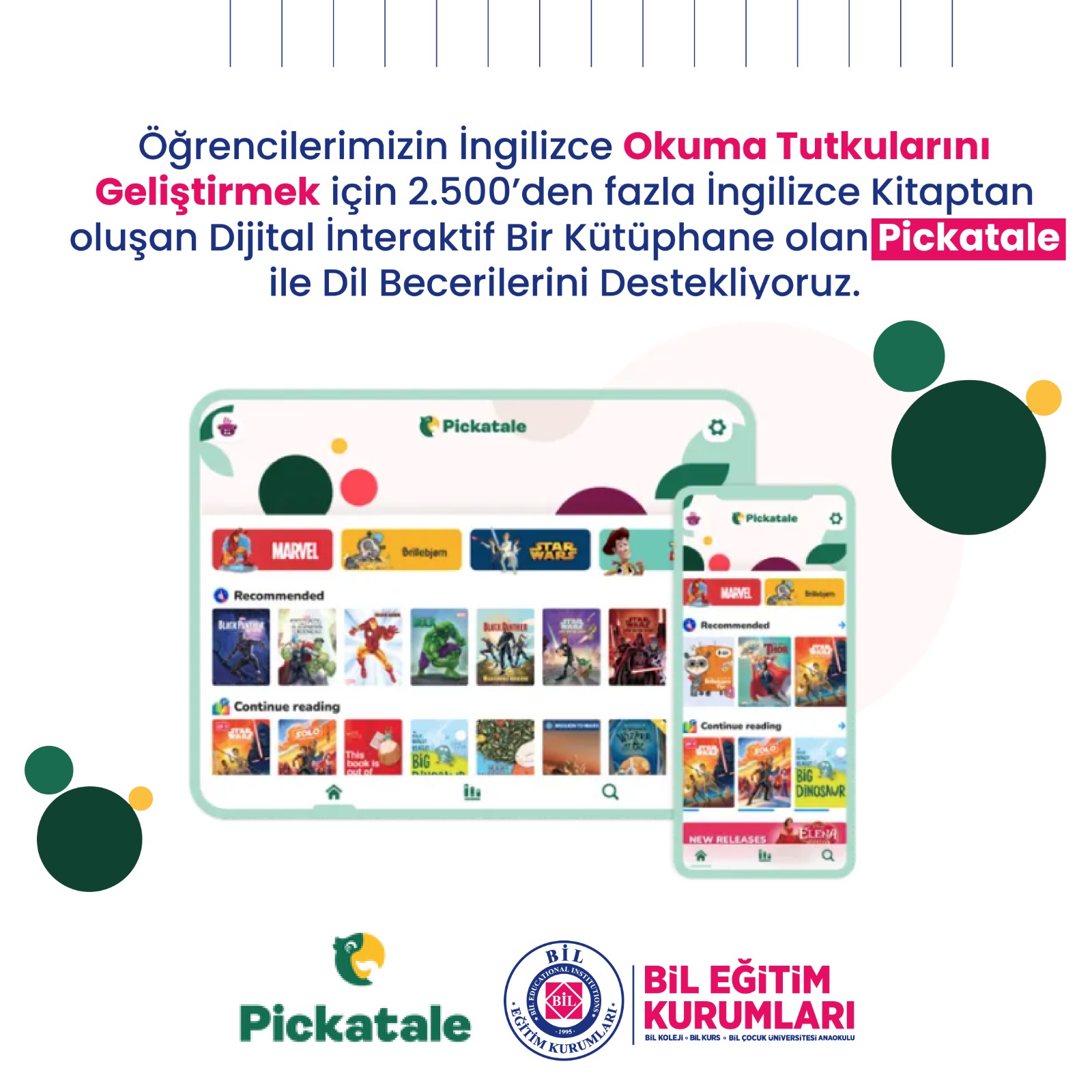 Öğrencilerimizin İngilizce Okuma Tutkularını Geliştirmek için 2.500'den fazla İngilizce Kitaptan Oluşan Dijital İnteraktif Bir Kütüphane olan Pickatale ile Dil Becerilerini Destekliyoruz.
