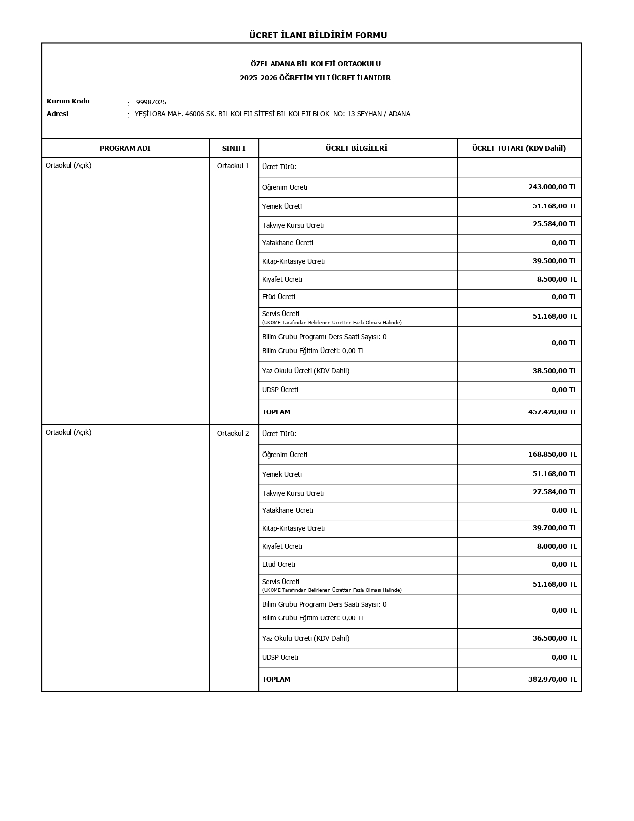 2025-2026 ÖĞRETİM YILI ÜCRET İLANI