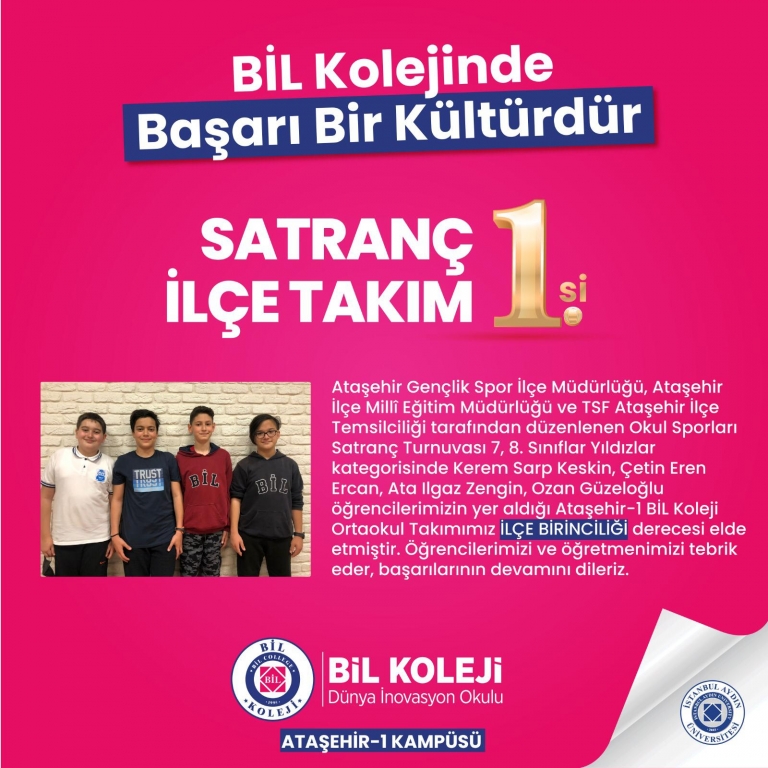 Ataşehir Gençlik Spor İlçe Müdürlüğü, Ataşehir İlçe Milli Eğitim Müdürlüğü ve TSF Ataşehir İlçe Temsilciliği tarafından düzenlenen Okul Sporları Satranç Turnuvası 7,8. Sınıflar Yıldızlar kategorisinde Kerem Sarp Keskin, Çetin Eren Ercan, Ata Ilgaz Zengin, Ozan Güzeloğlu öğrencilerimizin yer aldığı ortaokul takımımız İlçe Birinciliği derecesi elde etmiştir. Öğrencilerimizi ve öğretmenlerimizi tebrik eder, başarılarının devamını dileriz.