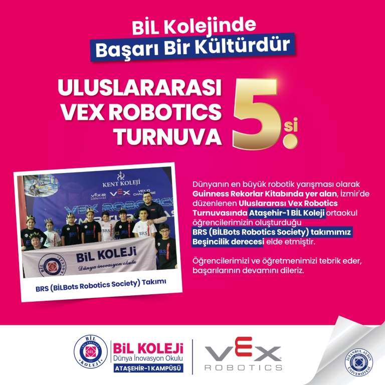 Dünyanın en büyük robotik yarışması olarak bilinen Guinness Rekorlar Kitabında yer alan, İzmir’de düzenlenen Uluslararası Vex Robotics Turnuvasında BRS (BilBots Robotics Society) takımımız 5.lik derecesi elde etmiştir. Öğretmen ve öğrencilerimiz tebrik eder, başarılarının devamını dileriz