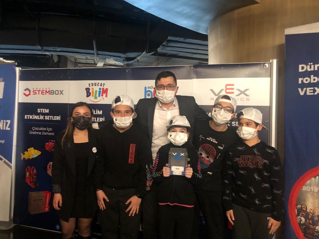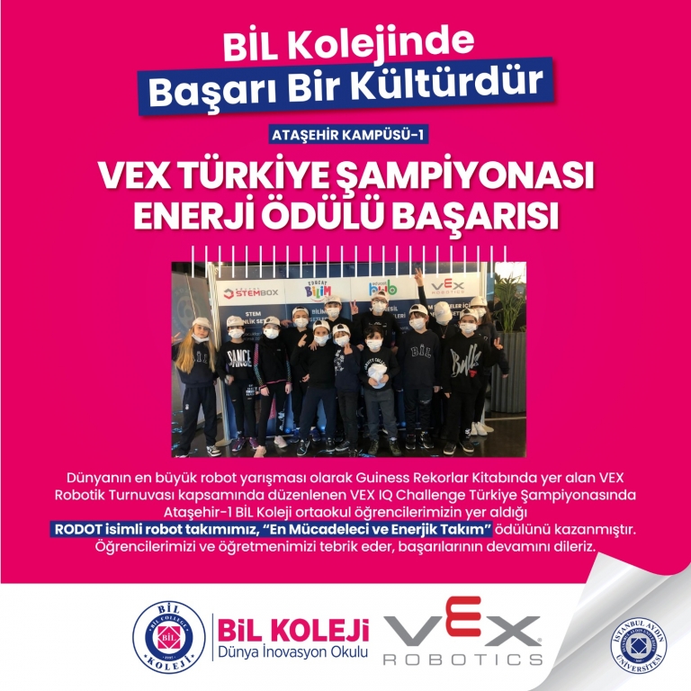 Ortaokul öğrencilerimiz Vex Robotik Türkiye Şampiyonası Yarışmasında Enerji Ödülü kazandılar. Dolu dolu, eğlenceli ve heyecanlı geçen bu yarışmada emeklerini sergileyen tüm öğrencilerimizi tebrik ederiz.