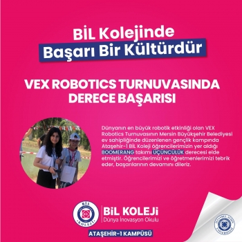 Ortaokul öğrencilerimiz Vex Robotik Mersin Yarışmasında Üçüncülük derecesi elde ettiler. Dolu dolu, eğlenceli ve heyecanlı geçen bu yarışmada emeklerini sergileyen tüm öğrencilerimizi tebrik ederiz.