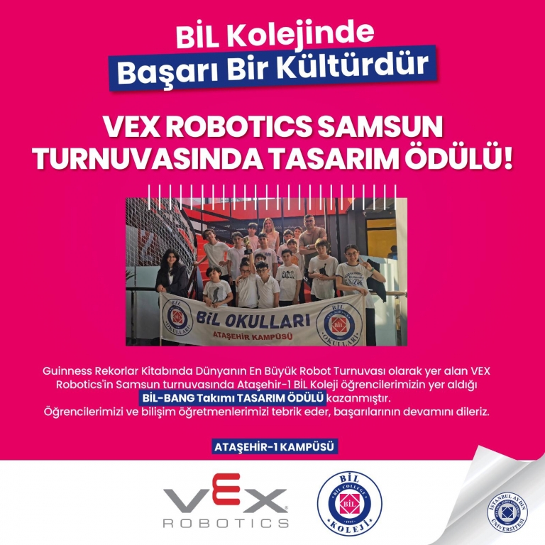 İlkokul öğrencilerimiz Vex Robotik Samsun Yarışmasında Tasarım Ödülü kazandılar. Dolu dolu, eğlenceli ve heyecanlı geçen bu yarışmada emeklerini sergileyen tüm öğrencilerimizi tebrik ederiz.