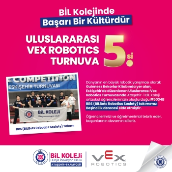 Dünyanın en büyük robotik yarışması olarak Guinness Rekorlar Kitabında yer alan, Eskişehir'de düzenlenen Uluslararası Vex Robotics Turnuvasında Ataşehir-1 Bil Koleji ortaokul öğrencilerimizin oluşturduğu #5034B BRS (BilBots Robotics Society) takımımız Beşincilik derecesi elde etmiştir.
