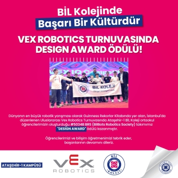 Dünyanın en büyük robotik yarışması olarak Guinness Rekorlar Kitabında yer alan, İstanbul'da düzenlenen Uluslararası Vex Robotics Turnuvasında Ataşehir-1 Bil Koleji ortaokul öğrencilerimizin oluşturduğu #5034B BRS (BilBots Robotics Society) takımımız "DESİGN AWARD" ödülü kazanmıştır.