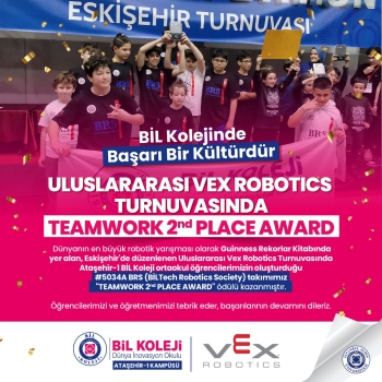 Dünyanın en büyük robotik yarışması olarak Guinness Rekorlar Kitabında yer alan, Eskişehir'de düzenlenen Uluslararası Vex Robotics Turnuvasında Ataşehir-1 Bil Koleji ortaokul öğrencilerimizin oluşturduğu #5034A BRS (BilTech Robotics Society) takımımız "TEAMWORK 2ND PLACE AWARD" ödülü kazanmıştır.