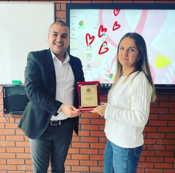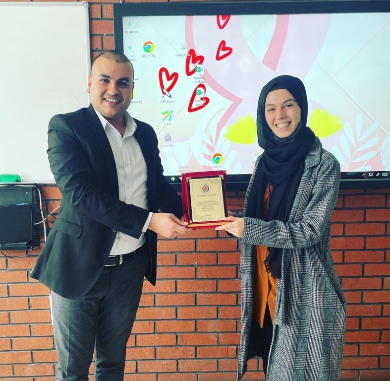 2022-2023 Eğitim Öğretim Döneminde üstün başarı ve çaba gösteren öğretmenlerimizden Sedef Topçu ve İrem Gül Kirli'ye plaketlerini teslim ederek teşekkürlerimizi sunuyoruz.