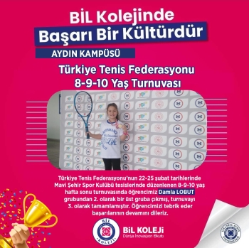 Türkiye Tenis Federasyonu'nun 22-25 Şubat tarihlerinde Mavi Şehir Spor Kulübü tesislerinde düzenlenen 8-9-10 yaş haftasonu turnuvasında grubundan 2. olarak bir üst gruba çıkmış, turnuvayı 3. olarak tamamlayarak madalyasını kazanmıştır. Öğrencimizi tebrik eder, başarılarının devamını dileriz.