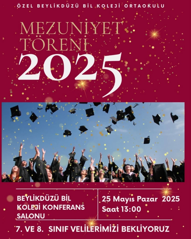 Siz değerli velilerimizi, 25 Mayıs Pazar günü saat 13.00’te Beylikdüzü BİL Koleji Konferans Salonu’nda gerçekleştireceğimiz Mezuniyet Törenimize bekliyoruz. Geleceğe umutla bakan 7. ve 8. sınıf öğrencilerimizin bu özel anında yanlarında olmanız bizleri onurlandıracaktır.