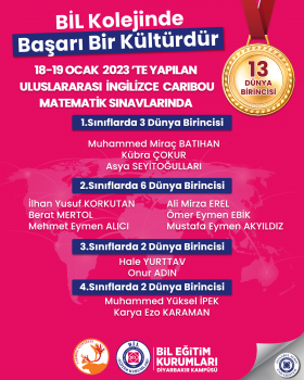 18-19 OCAK 2023 ’TE YAPILAN ULUSLARARASI İNGİLİZCE CARIBOU MATEMATİK SINAVLARINDA 13 DÜNYA BİRİNCİSİ