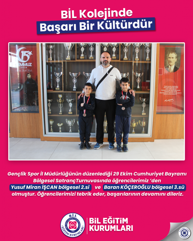 Gençlik Spor İl Müdürlüğünün düzenlediği 29 Ekim Cumhuriyet Bayramı Bölgesel Satranç Turnuvasında öğrencilerimiz ’den Yusuf Miran İŞCAN bölgesel 2.si ve Baran KÖÇEROĞLU bölgesel 3.sü olmuştur. Öğrencilerimizi tebrik eder, başarılarının devamını dileriz.