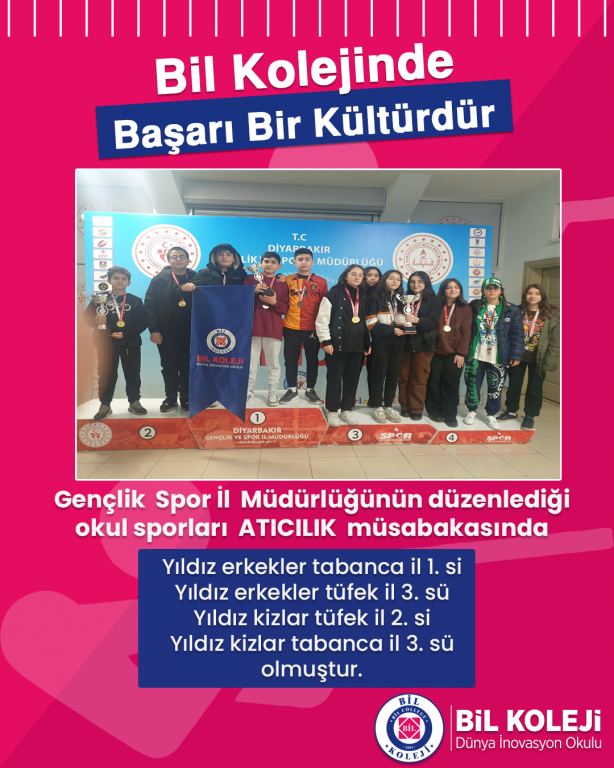 Gençlik Spor İl Müdürlüğünün düzenlediği okul sporları ATICILIK müsabakasındaYıldız erkekler tabanca İL 1. si ,Yıldız erkekler tüfek İL 3. sü , Yıldız kızlar tüfek İL 2. si Yıldız kızlar tabanca İL 3. sü olmuştur.