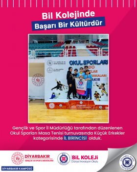 Gençlik ve Spor İl Müdürlüğü tarafından düzenlenen Okul Sporları Masa Tenisi turnuvasında Küçük Erkekler kategorisinde İL BİRİNCİSİ olduk.