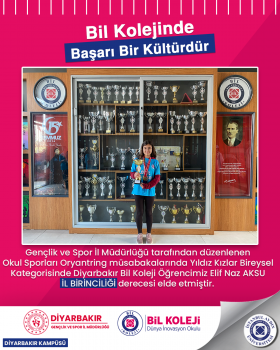 Gençlik ve Spor İl Müdürlüğü tarafından düzenlenen Okul Sporları Oryantring müsabakalarında Yıldız Kızlar Bireysel Kategorisinde Diyarbakır Bil Koleji Öğrencimiz Elif Naz AKSU İL BİRİNCİLİĞİ derecesi elde etmiştir.