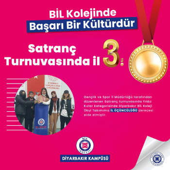Gençlik ve Spor İl Müdürlüğü tarafından düzenlenen Satranç turnuvasında Yıldız Kızlar kategorisinde Diyarbakır BİL Koleji Okul Takımımız İL ÜÇÜNCÜLÜĞÜ derecesi elde etmiştir.