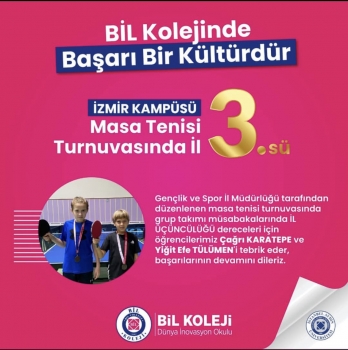 Gençlik ve Spor İl Müdürlüğü tarafından düzenlenen masa tenisi turnavasında grup takımı müsabakalarında İL ÜÇÜNCÜLÜĞÜ dereceleri için öğrencilerimiz ÇAĞRI KAREATEPE ve YİĞİT EFE TÜLÜMEN'i tebrik eder, başarılarının devamını dileriz.