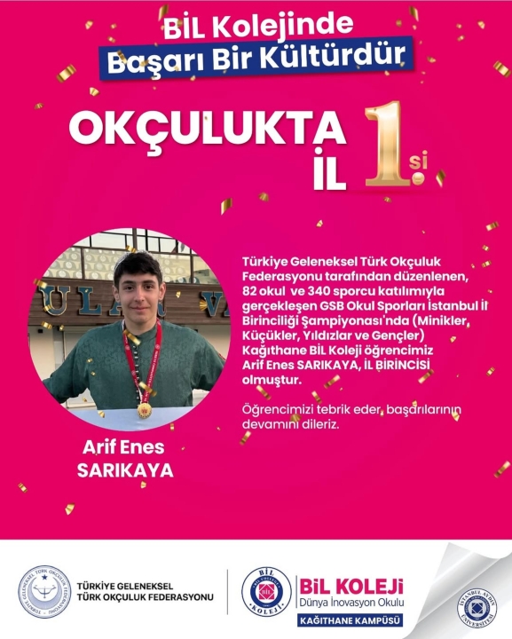 Türkiye Geleneksel Türk Okçuluk Federasyonu tarafından düzenlenen, 82 okul ve 340 sporcunun katıldığı GSB Okul Sporları İstanbul İl Birinciliği Şampiyonası’nda öğrencimiz Arif Enes Sarıkaya il birincisi olmuştur