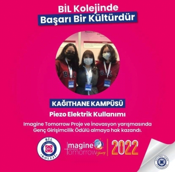 Kağıthane Kampüsü Piezo Elektrik Kullanımı Projesi ile öğrencilerimiz Imagine Tomorrow Proje ve İnovasyon Yarışmasında Genç Girişimcilik Ödülü almaya hak kazandı.