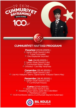 Cumhuriyetimizin 100. yılı münasebetiyle okulumuzda Cumhuriyet Bayramı haftası ilan edildi. Bu hafta boyunca çeşitli etkinlik ve anmalar gerçekleştirilecektir. Okulumuzda gerçekleştirilecek etkinliklerimiz resimde ki gibi ilerleyecektir. Cumartesi günü ise velilerimizi de kutlamamıza bekliyoruz.