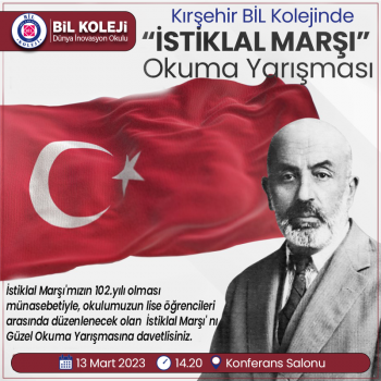 İstiklal Marşı' nın Kabulü ve Merhum Mehmet Akif Ersoy' u anma günü kapsamında Kırşehir Bil Koleji Konferans Salonunda Saat: 14.20 de lise öğrencilerimiz arasında İstiklal Marşı' nı güzel okuma yarışması düzenlenecektir. Programımıza tüm öğrencilerimiz ve velilerimiz davetlidir.