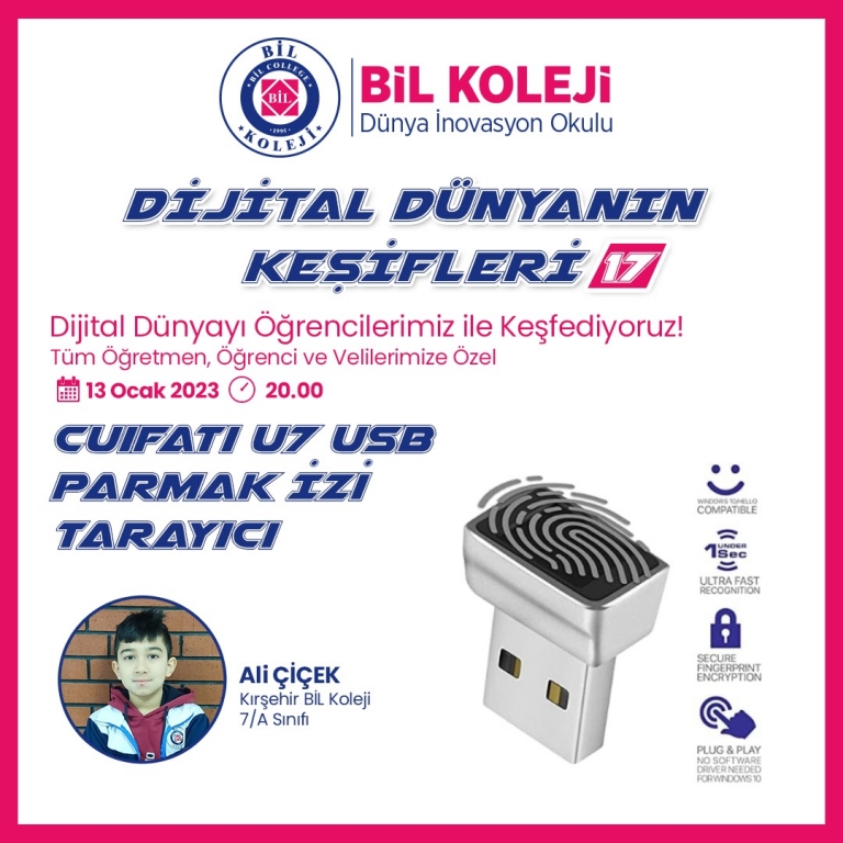 Kırşehir BİL Koleji 7-A sınıfı öğrencisi Ali ÇİÇEK 13 Ocak 2023 Tarihi ve 20.00 saatinde Dijital Dünyanın Keşifleri isimli programda bir sunum gerçekleştirecektir. Tüm BİL Ailesini bekliyoruz.