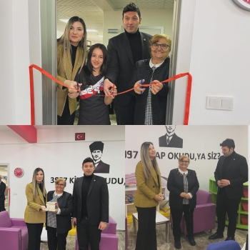 Açılış kurdelesini Bil Kolejleri Genel Müdürü Sayın Elif Pehlevan, ÜK Okullar Direktörü Kampüs Müdürümüz Yasin Haboğlu ve Kütüphane Müdürü Şehnaz Taş tarafından kesildi.